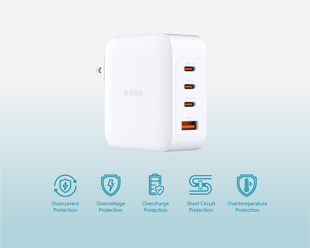 Experience next-level charging with the D-Link DCF-141 140W GaN Charger. Designed for home workspaces, it delivers fast, efficient power to your laptop, tablet, cell phone, and more while staying cooler and more compact than traditional chargers. With advanced GaN technology, it keeps your setup running smoothly without the bulk or heat.