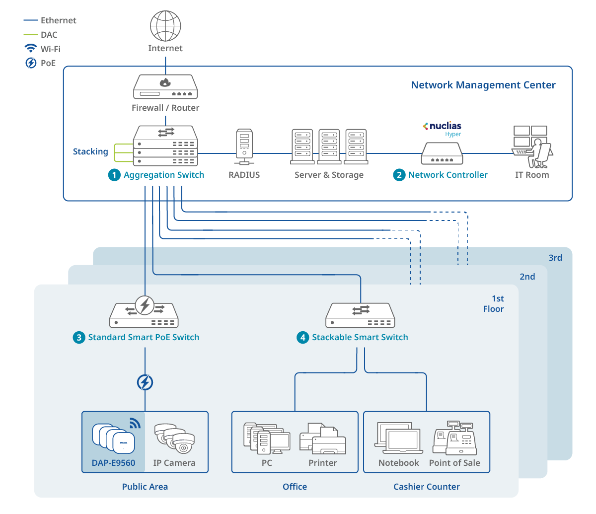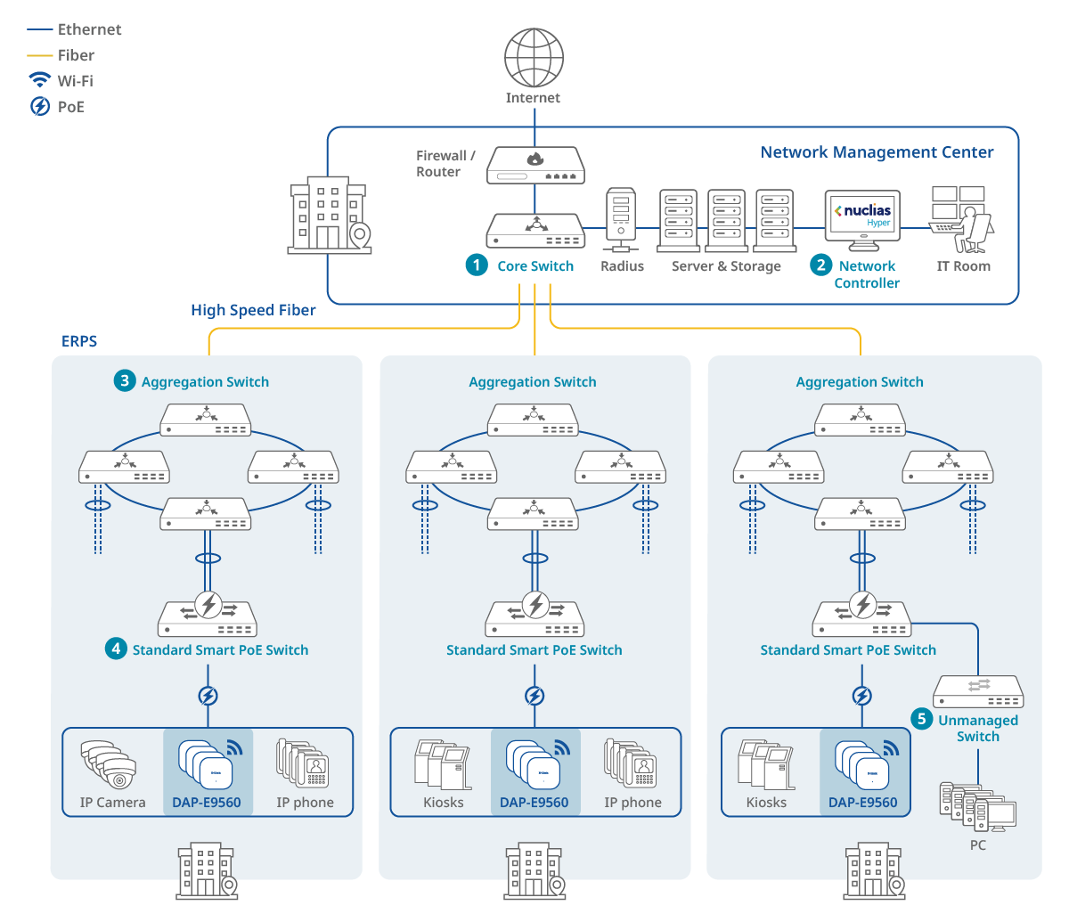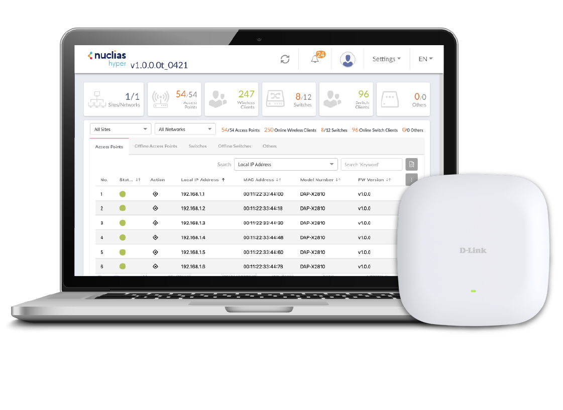 Le DAP-E9560 s’intègre parfaitement au contrôleur réseau Nuclias de D-Link et à la plateforme de gestion logicielle, offrant aux entreprises des capacités de gestion centralisée et à distance. Accessible de partout via une connexion Internet, cette solution permet un contrôle simplifié du réseau, l’automatisation et une évolutivité sans effort. Grâce aux analyses et aux rapports intégrés, il fournit des informations exploitables sur l’ensemble de votre réseau, jusqu’à chaque point d’accès, pour une prise de décision plus intelligente.