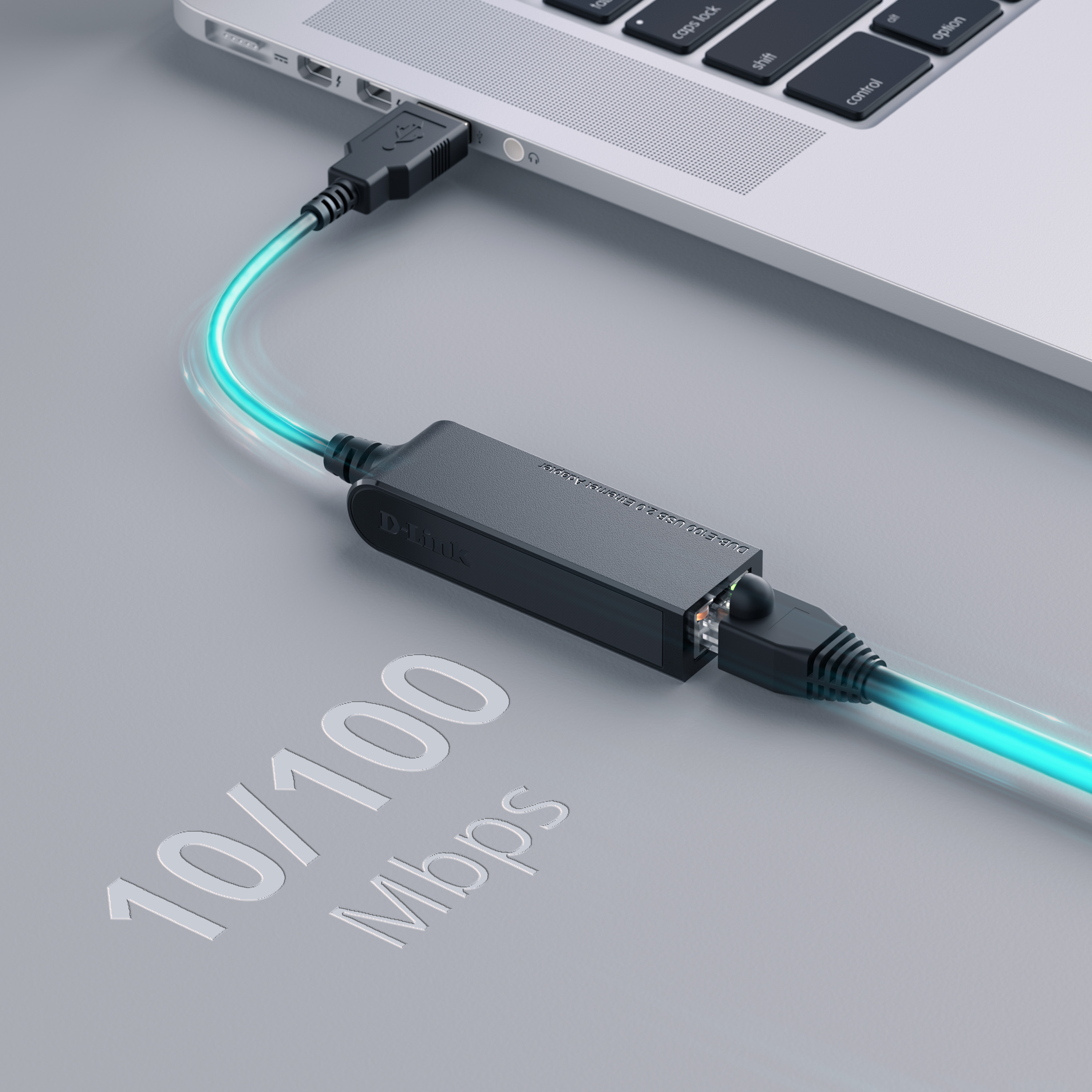 The D-Link DUB-E100 provides a standard RJ-45 connector for a quick and simple method of connecting to an Ethernet 10Mbps or Fast Ethernet 100Mbps based LAN via a network hub or switch. The built-in USB 2.0 cable connects directly to your computer or laptop.