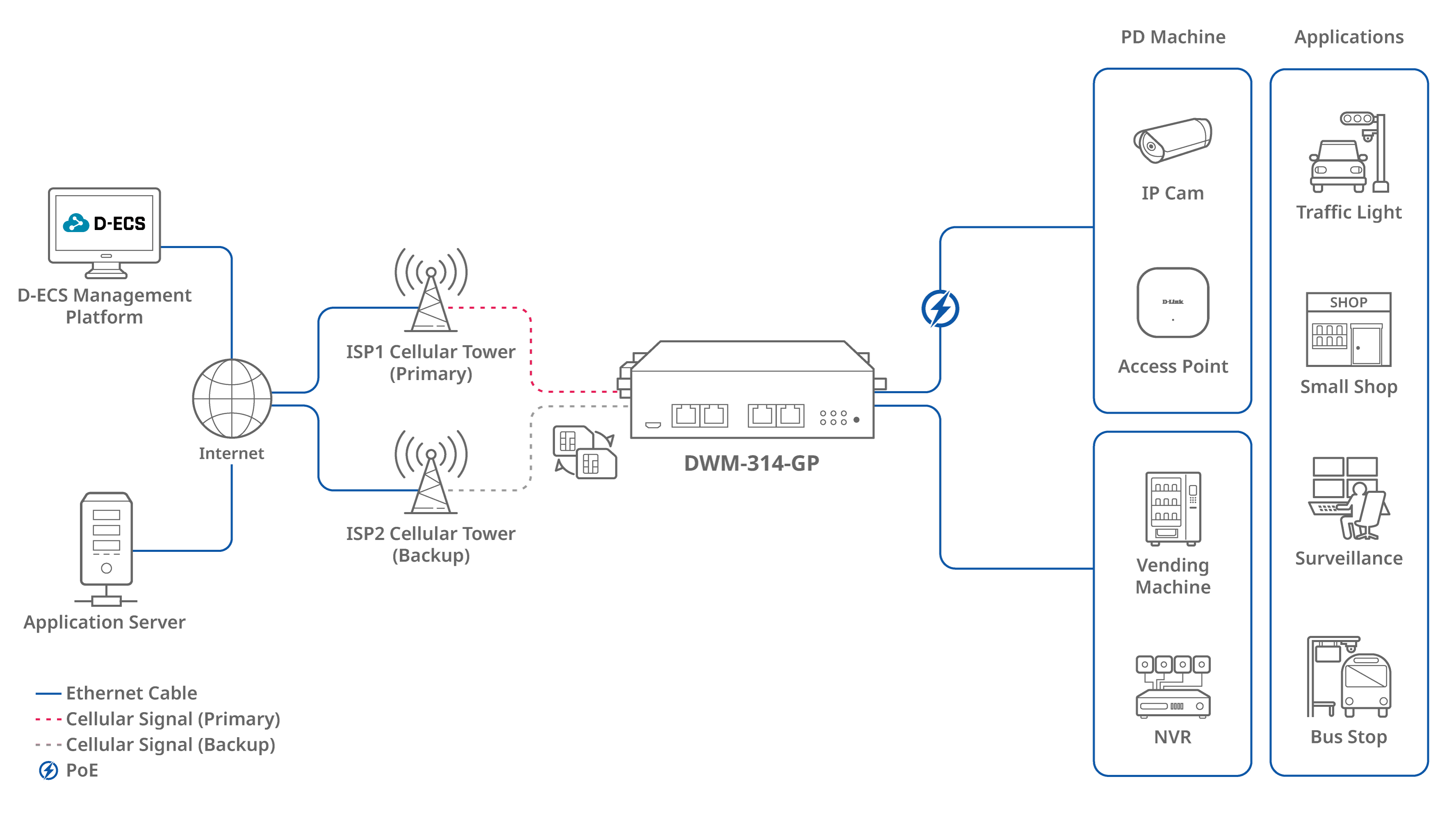 The DWM-314-GP 5G Multi-Connect PoE modem harnesses the power of 5G to deliver ultra-fast speeds and low latency, ensuring dependable connectivity. Featuring dual SIM slots with failover capabilities, it provides uninterrupted service even if one network is down. Ideal for constructing smart city infrastructures such as smart poles for traffic monitoring, digital signage advertising, and environmental sensing, this plug-and-play modem simplifies installation for quick deployment. With its ability to switch seamlessly between 4G and 5G, the DWM-314-GP maintains stable connectivity in varying network conditions, enhancing local engagement by delivering timely information, advertisements, and services efficiently.