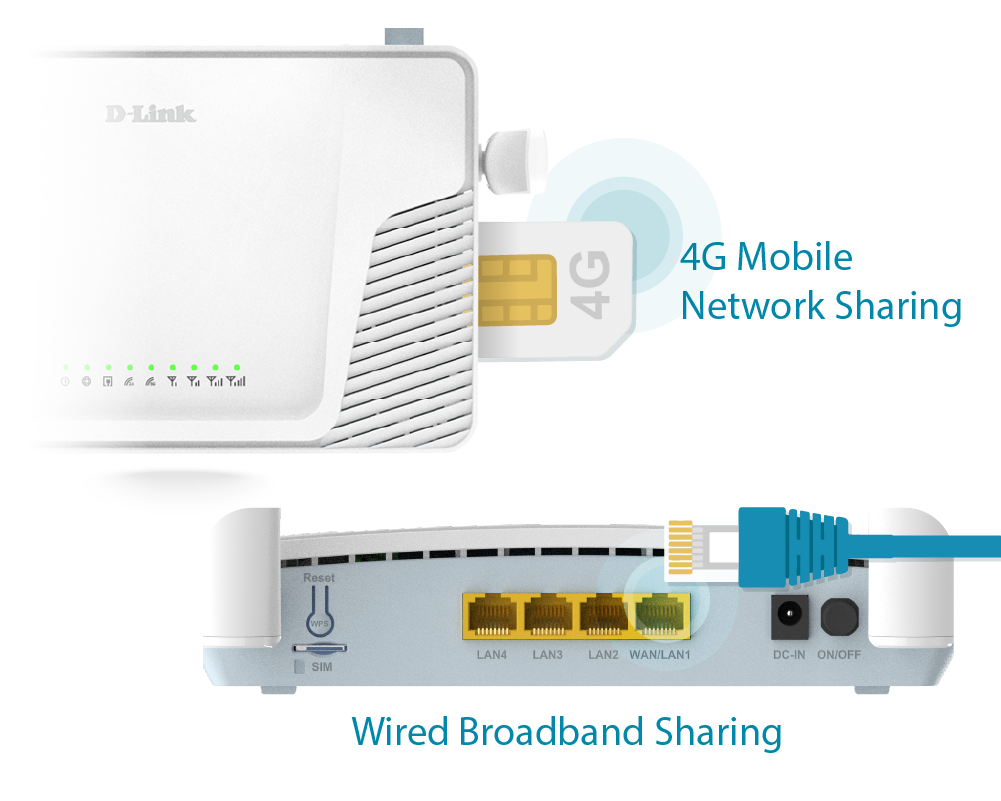 3 x Gigabit Ethernet LAN port 1 x Gigabit Ethernet WAN/LAN port 1 x WPS/Reset button 1 x Power button 1 x SIM Card slot (Nano SIM: 4FF) 1 x power connector |