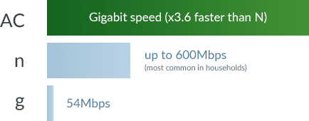 Το Wireless AC παρέχει Gigabit ασύρματες ταχύτητες έως και 3,6 φορές μεγαλύτερη από την απόδοση του πιο συνηθισμένου τύπου Wi-Fi που βρίσκεται στα περισσότερα νοικοκυριά.