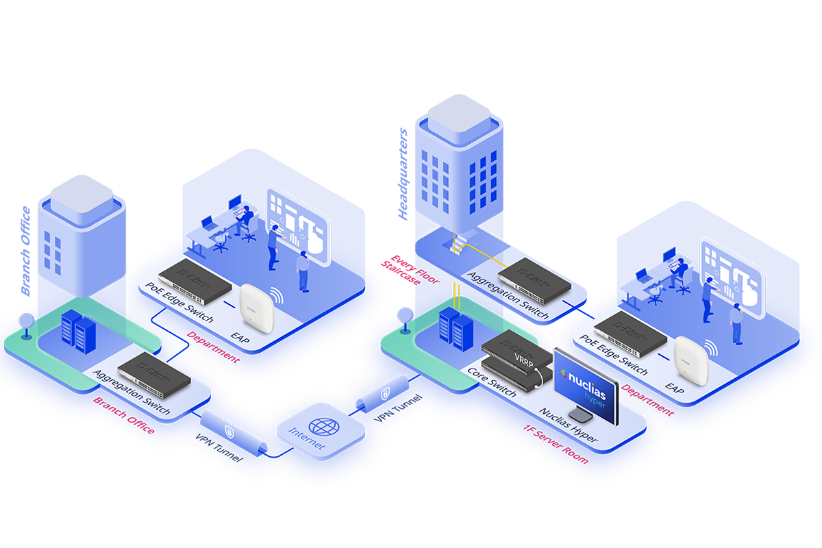 The Nuclias Hyper software controller enables centralized management across distributed networks by securely connecting headquarters, branches, and remote sites via VPN tunnels. IT teams can deploy, monitor, and manage 2000 devices—including core, aggregation, and PoE edge switches, as well as wireless access points—from a unified dashboard.
