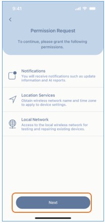 Step 4: You’ll be prompted to allow the app to use your mobile device’s Notification, Location and Local Network. Tap Next to continue.