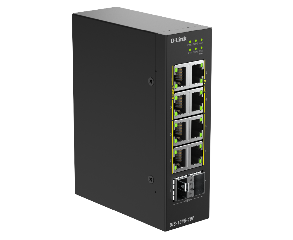The DIS-100G-10P is an industrial unmanaged switch equipped with eight 1G PoE ports and two SFP ports, providing plug-and-play simplicity for deployment. The SFP ports support long-range data transmission, removing the distance limitations of traditional Ethernet cabling. With reliable, high-performance operation, it's well-suited for edge deployments in applications like HD surveillance, wireless access points, and more.