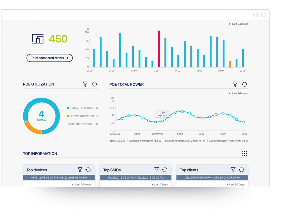 Through the Nuclias dashboard, you can easily view your switches1 real-time port traffic and connection status. And for switches that support PoE, you can monitor real-time power consumption statistics. You can also remotely view real-time information about the network and get an instant overview of key network statistics such as performance, connectivity, and network usage.