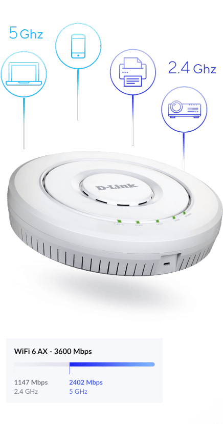 Uses the latest Wi-Fi technology to deliver reliable wireless performance and reduce congestion, with combined maximum wireless signal rates of up to 3.6 Gbps (1147 Mbps on 2.4 GHz band and 2402 Mbps on 5 GHz band)2. Together with OFDMA and MU-MIMO support, the DWL-X8630AP gives your business a faster wireless network with higher capacity and efficiency.