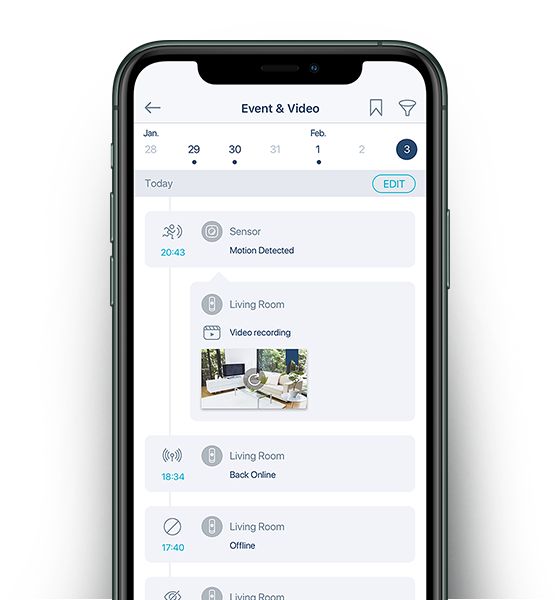 Cloud recording gives you peace of mind, with videos automatically sent to the mydlink™ Cloud. Enjoy 1-year free 24‑hour footage retention, with optional premium Cloud storage plans starting at 2.49€/month. Find any clip by filtering your recordings by Event Type, Date, Device, and Location. Know exactly what's going on - watch recordings from the Cloud or download videos clips to your phone anywhere, anytime.