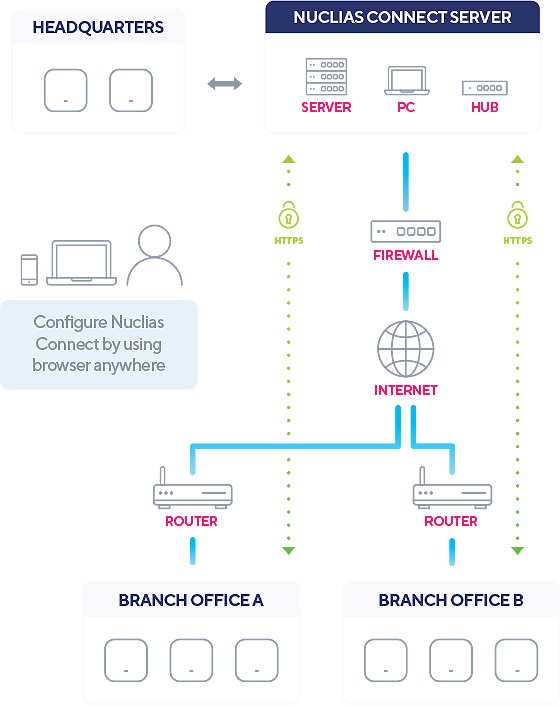Since Nuclias Connect's software operates transparently on the network, an AP can be deployed anywhere in a Layer 2/3 environment. Additionally, administrators can provide and manage a variety of distributed deployments, including the option to configure settings and administrator accounts in a specific manner for each deployment.