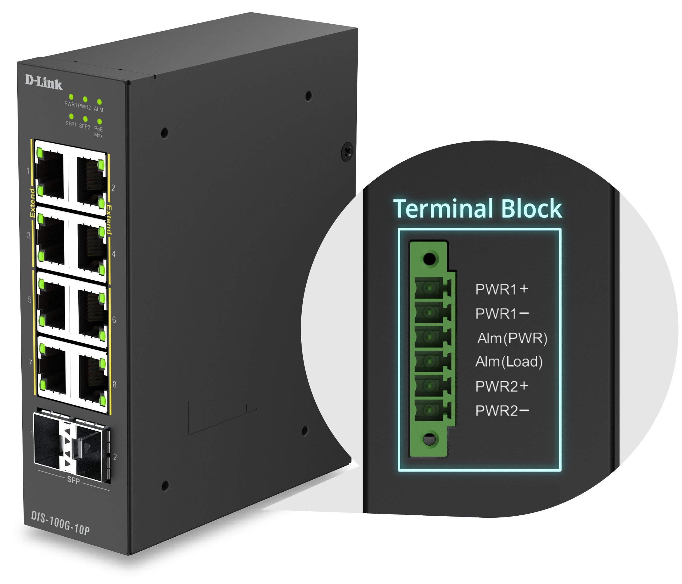 The DIS-100G-10P is equipped with eight PoE ports compliant with IEEE 802.3af/at standards, delivering both data and power through a single Ethernet cable. Using the built-in DIP switch, ports 1 - 4 can be set to “Extend Mode”, supporting transmission distances of up to 250 meters at 10 Mbps, perfect for surveillance cameras that require stable, long-distance connectivity.