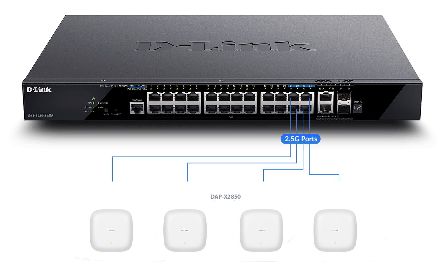 Multi-Gigabit 2.5G ports on the DGS-1520 Series PoE switches eliminate potential bottlenecks when connecting to Wi-Fi 6 access points capable of Gigabit+ wireless speeds.