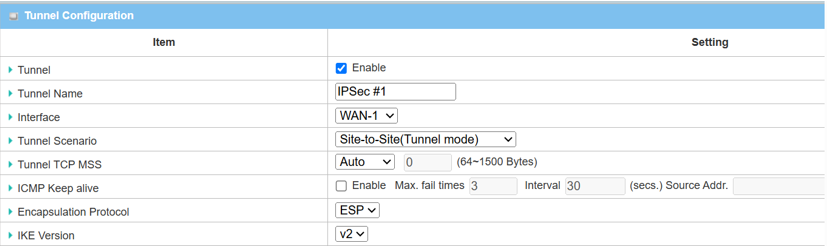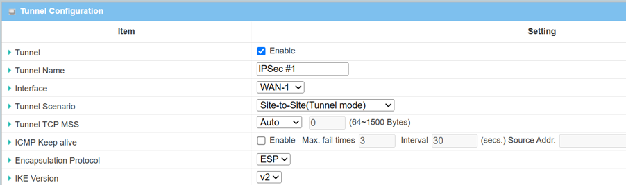 3. The Tunnel Configuration will appear, click the Enable box to enable the IPsec tunnel.