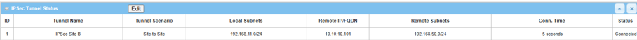 The Status of IPsec Tunnel List displays "Connected" for Site B Device 2.