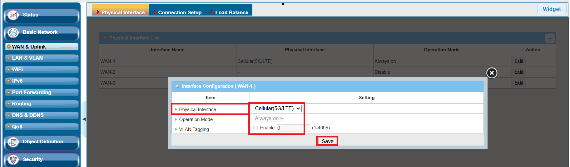 Go to Basic Network > WAN & Uplink > Physical Interface tab