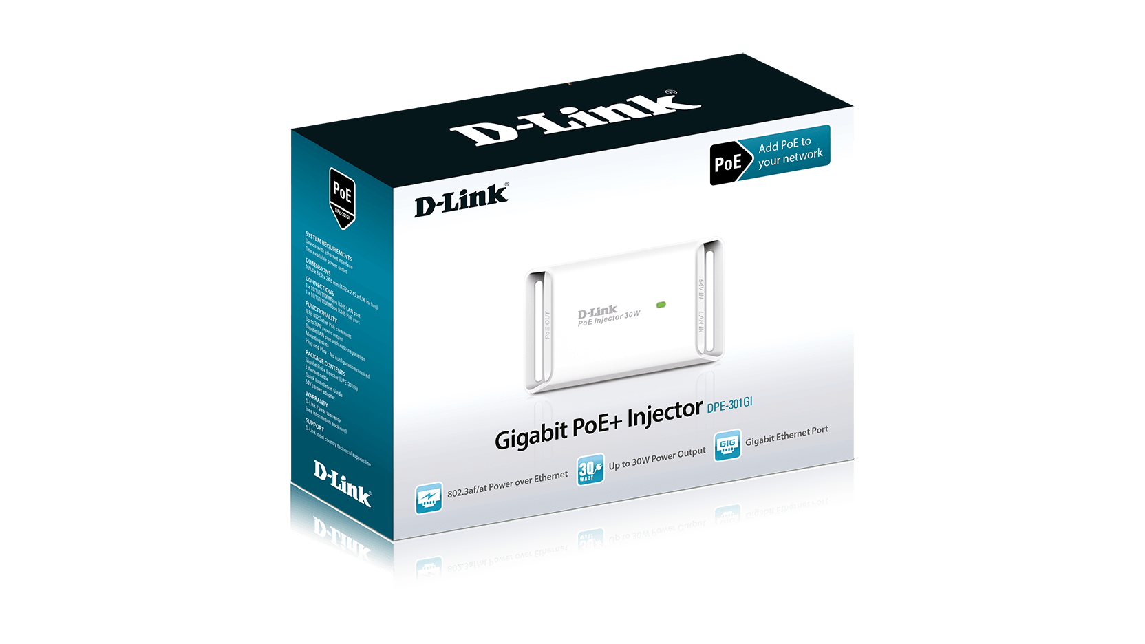 D-Link's DPE-301GI combines electrical power with a Gigabit network connection to produce a Gigabit Power over Ethernet (PoE) signal for transmission over a single Ethernet cable, to up to 100 metres1 distance.