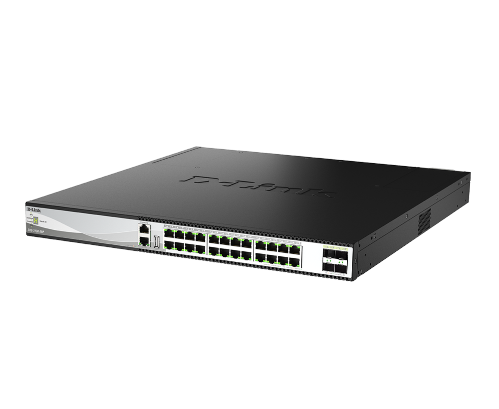 The DXS-3130-28P supports 802.3af/at/bt PoE standards, delivering up to 60 W per port with Perpetual and Fast PoE.