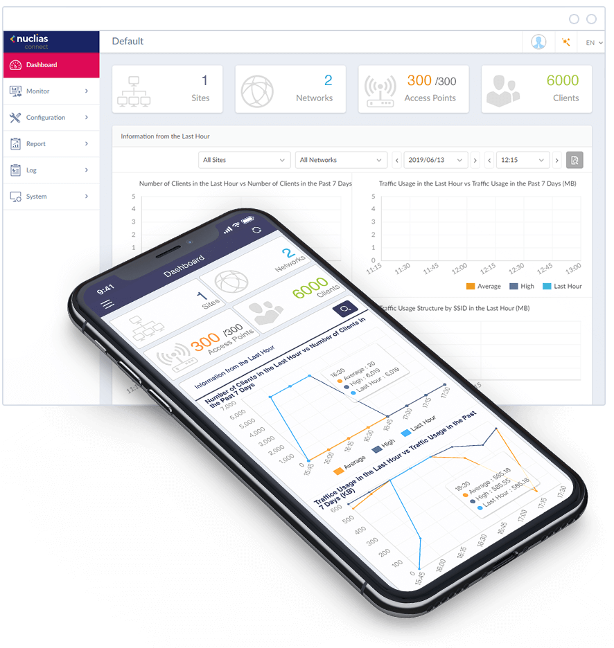 Nuclias Connect enables you to manage and control your network from anywhere with an Internet connection. It provides an extensive understanding of your network and its users through traffic analytics and status reports, which can be viewed at a glance through an intuitive interface on PC, or phone via our app. Insights derived from this traffic data can be used to create business value, and traffic can be viewed across the entire network, to the level of a single AP.