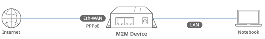 The topology for this configuration involves setting up an M2M device to connect local devices within the LAN to external networks, acting as a WAN. Below is a simplified diagram illustrating the setup.