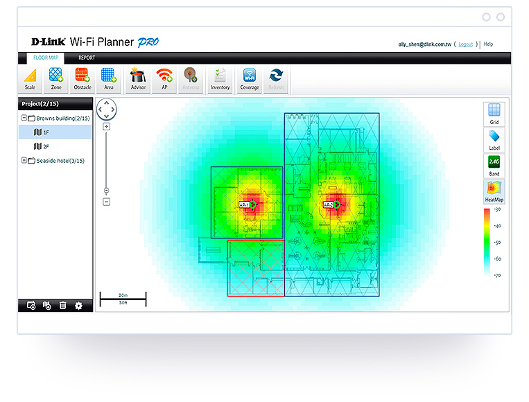 Tööriist Wi-Fi Planner Pro võimaldab teil enne seadme kasutuselevõttu Wi-Fi-keskkonda näha. See muudab WLAN-i kasutuselevõtu planeerimise ja klientidega suhtlemise palju lihtsamaks. Wi-Fi Planner Pro on üks D-Linki partneriportaalis saadaolevatest tasuta tööriistadest, mis on mõeldud ainult D-Linki partneritele.