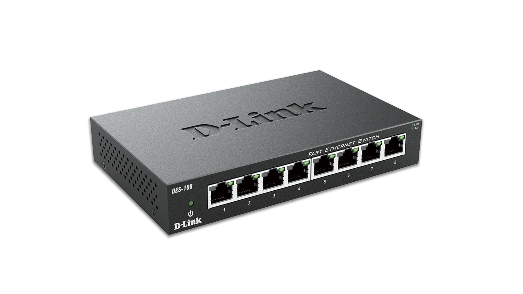 The DES-108 8-Port Fast Ethernet Unmanaged Desktop Switch is a 8-port 10/100 Mbps Fast Ethernet switch that allows you to quickly set up a wired network. Connect the DES-108 to multiple computers together to share files and folders, or connect it to a router to share an Internet connection.