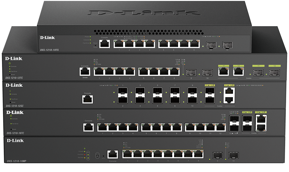 The DXS-1210 series includes layer 2 features such as port mirroring, Spanning Tree Protocol (STP), and Link Aggregation Control Protocol (LACP). They also support IP interfaces, ARP, IPv6 Neighbor Discovery (ND), default routing, IPv4/IPv6 static routing, IGMP and MLD Snooping, auto voice and surveillance VLAN, LLDP and LLDP-MED.