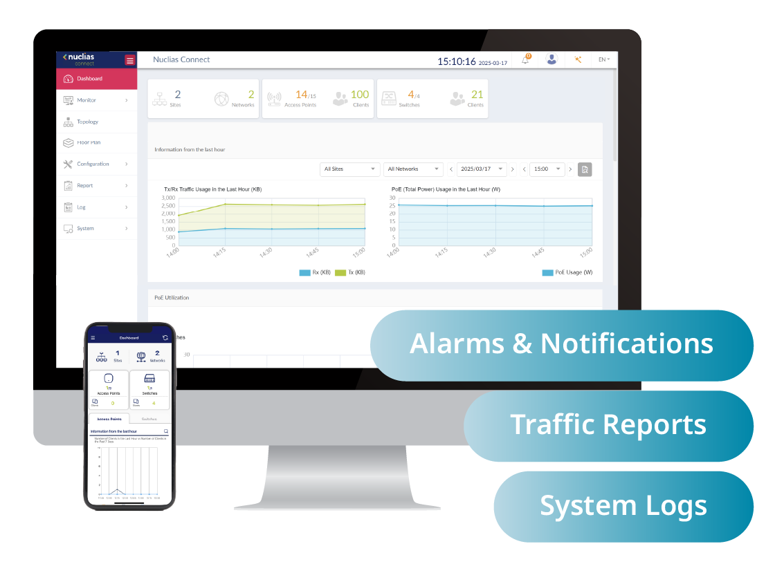 Get complete network visibility with real-time monitoring of APs and switches. Instantly view client counts, traffic, channel use, PoE status, and event logs. Monitor signal quality, client data, and switch activity — including IP, MAC, VLAN, port info, and PoE usage — with built-in tools for port control and VLAN settings. Traffic and performance reports reveal peak usage, top APs, PoE consumption, and error trends. Comprehensive logs and real-time alerts ensure security and system stability.