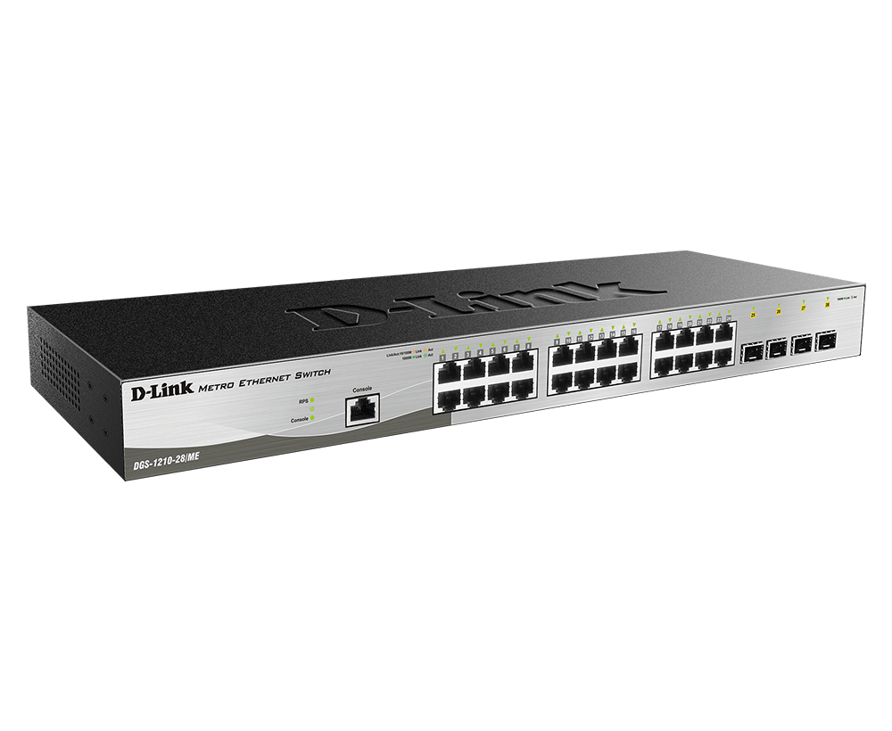 The DGS-1210ME Series Metro Ethernet Switches feature a variety of port configurations, including 10/100/1000BASE-T RJ-45 ports, 1G SFP ports, and 10G SFP+ ports for increased network bandwidth. Surge protection, advanced Layer-2 functions, and a suite of security and management tools make the DGS-1210ME Series Metro Ethernet Switches ideal for Metro Ethernet applications.