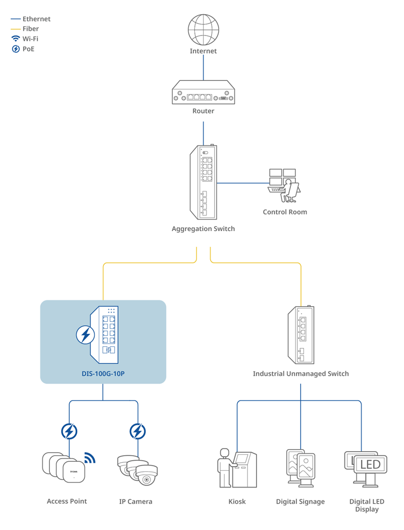 The DIS-100G-10P features two SFP ports that enable flexible, long-distance fiber connections, perfect for extending your network across remote sites or between buildings. Fiber optic cabling goes beyond the distance limitations of traditional Ethernet, offering high bandwidth and strong resistance to interference. This ensures stable, high-performance transmission in industrial environments where reliability is essential.