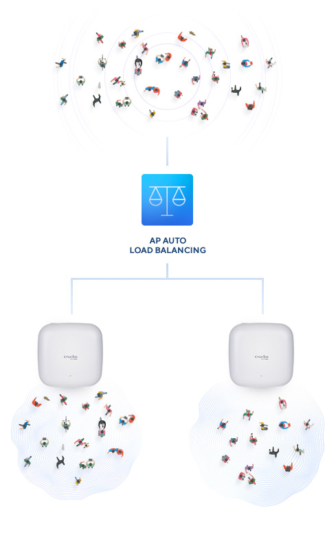 Lorsque plusieurs points d'accès sont déployés au même endroit, Nuclias Cloud prend en charge l'équilibrage automatique de la charge entre eux sans avoir besoin de matériel ou de configuration supplémentaire. Le réseau Wi-Fi fonctionne ainsi de manière optimale, à tout moment. BSS Colouring, OFDMA et MU-MIMO augmentent la capacité et l’efficacité du réseau sans fil.